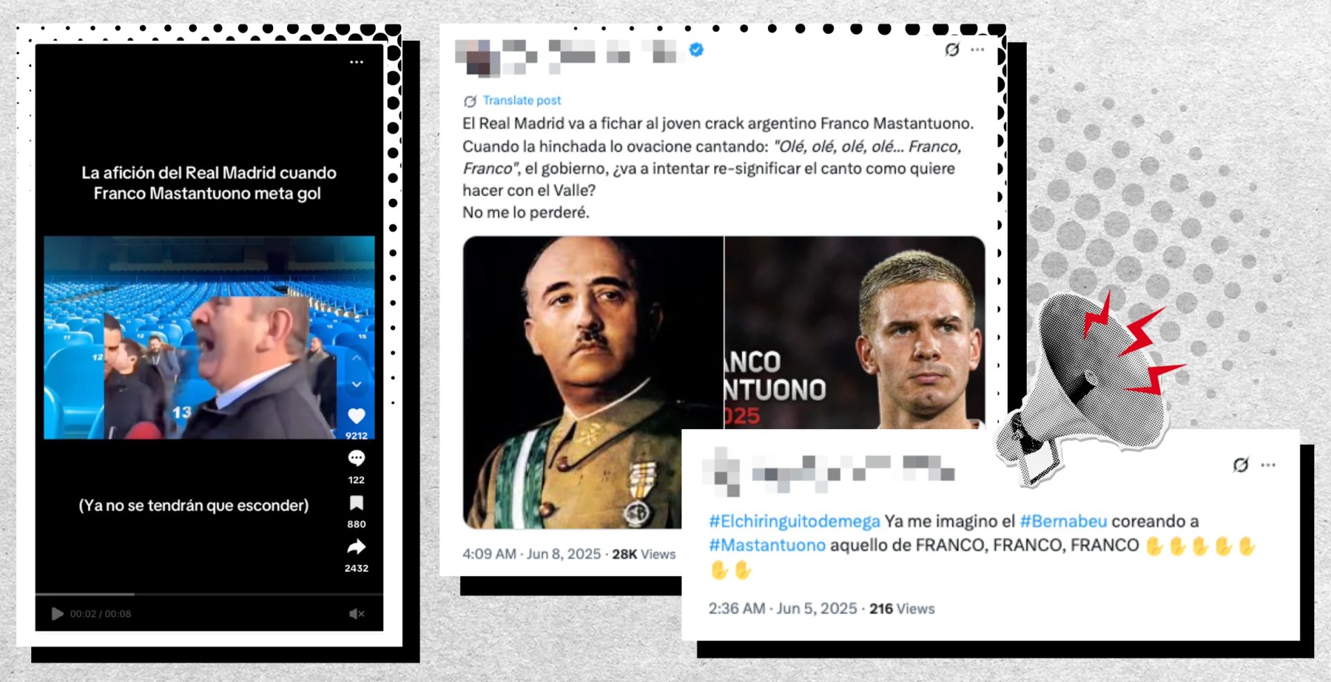 The names and images of some players are used to talk explicitly about dictators. The case with the most impact in Spain, according to content analysed, is that of Franco Mastantuono, an 18-year-old Argentine football player who signed a contract with Real Madrid in the 2025 summer transfer market. Until the transfer was made official, social media speculated about the midfielder’s future, with dozens of posts referring to Francisco Franco or the Franco dictatorship, taking advantage of the coincidence of the Argentine’s name with the dictator’s surname.