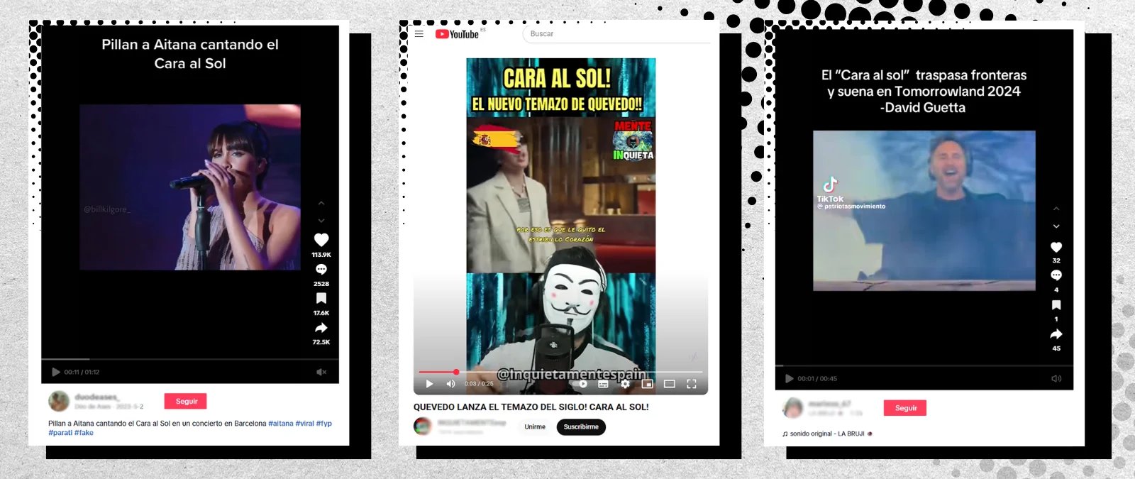 It doesn’t end with RAC music. There is also space for a less current but no less mainstream musical trend. Contents that use songs directly linked to the Francoist movement in Spain stand out. One example is the different versions circulating on social media of Cara al sol, the hymn of the Spanish Falange composed on December 3, 1935, and made the “national hymn” of Francisco Franco’s regime in 1937. Both more traditional versions of the song (such as this TikTok audio by the Auxiliary Military Academy Band, which has already been used in more than 4,600 videos) and other interpretations with more contemporary musical styles and manipulated videos of current artists supposedly singing this song, including the Spanish singer Aitana, the Canarian artist Quevedo, and DJ David Guetta, have gone viral. There was even a manipulated video of French-Spanish footballer Le Normand “playing” Cara al Sol on the piano.