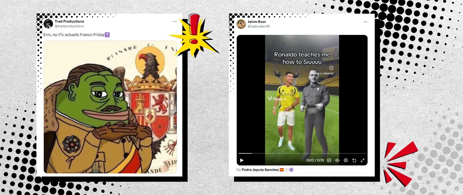 Franco as a green frog (known as Pepe the Frog, a comic book character who ended up becoming a symbol of hate, depicted as Adolf Hitler and a member of the white supremacist KKK) or with pink glasses, videos of Mussolini dancing or Hitler imitating Cristiano Ronaldo’s celebration. Images have greater visual power than any text, and those who use them are aware of the impact they can have.