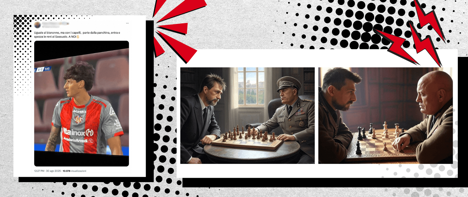 This same trend has also appeared with other players such as Angelo Stiller, a German soccer player who stars in social media content due to his alleged resemblance to Hitler. Another example is Romano Benito Floriani Mussolini, an Italian player and great-grandson of dictator Benito Mussolini. He previously played for Lazio, a club whose fans have displayed banners in the stands with slogans glorifying fascism. Although the Italian has publicly requested to keep his second surname, at Cremonese, the team he is playing for this season on loan, he goes by the name Romano. In December 2024, a video circulated on social media in which fans of his then-team celebrated a goal by giving the fascist salute. Between late August and early September 2025, coinciding with the start of the new Serie A season and the debut of Romano Floriani Mussolini, on X the memes were proliferating. The memes aimed to portray the player as the ideal continuer of the family tradition and conveyed fascist slogans and quotes like “A noi” (“to us”) and “Vincere e vinceremo” (“We shall win and we shall conquer”). Another favorite target of the “Football Twitter” community is Inter player Francesco Acerbi, often portrayed (with the help of artificial intelligence) wearing an SS uniform and in the company of Mussolini or Hitler. This content plays on a supposed physical resemblance between the footballer and the Nazi dictator, due mainly to prominent mustaches, but also to an off-field episode: in 2024 the Inter defender was accused (and later cleared by the sports judge, because match footage did not allow it to be proven) of having directed racist insults at opponent Juan Jesus during a March 2024 match against Napoli.